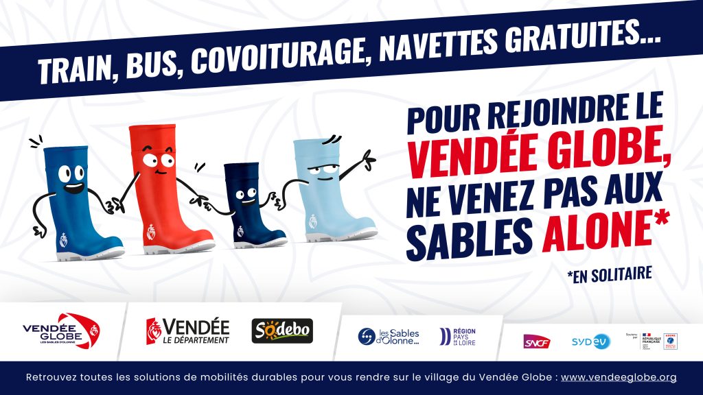 >> “Train, bus, covoiturage, navettes gratuites… Pour rejoindre le Vendée Globe, ne venez pas au Sables Alone*” *En solitaire