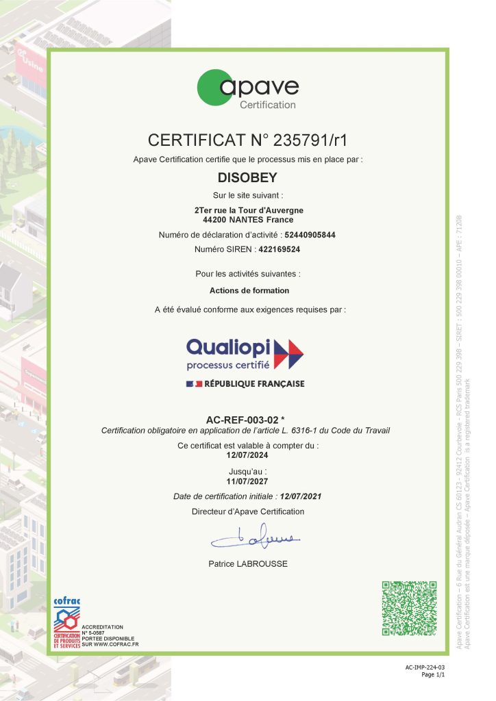 L’agence Disobey est certifiée QUALIOPI, pour la prise en charge financière sur vos crédits formations.